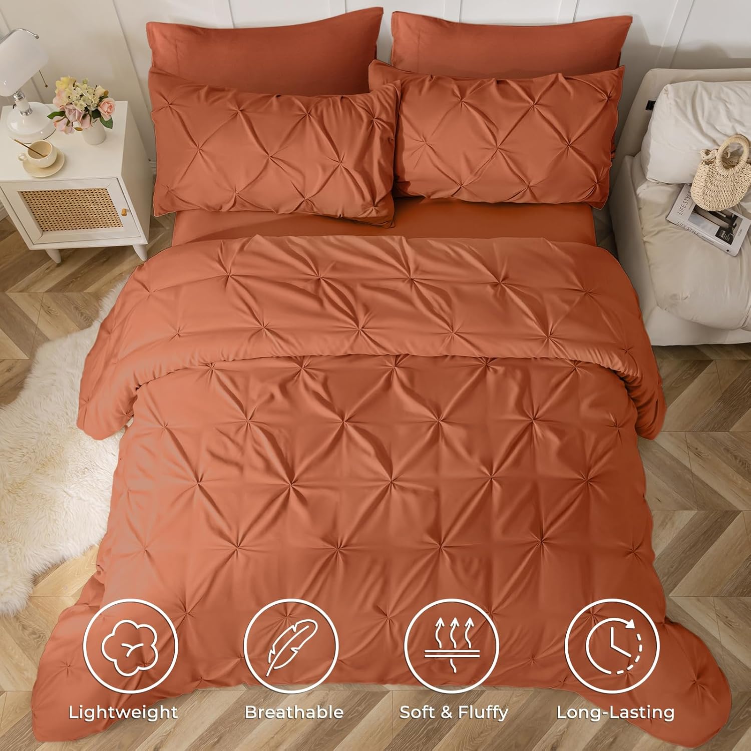 Comforter Set, 7-Piece Bed in a Bag, Pintuck Bedding Sets for All Season, Includes Comforter, Flat Sheet, Fitted Sheet, Pillowcases and Pillowshams, Burnt Orange