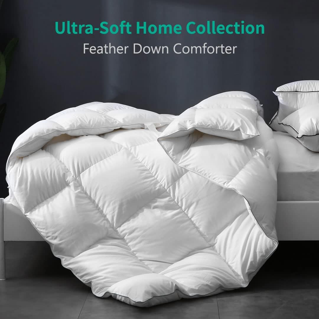 - ALL-SEASONS Feather Down Fiber Comforter – FULL/QUEEN size Feather Down Fiber Comforter is 90×90 inches and 46 Oz fill weight. The organic Feather Down Fiber Comforter provides medium warmth and is perfect for year-round use -no matter summer, autumn, spring, or winter night. Lightweight, Medium, and Heavyweight feather Down Fiber duvet for choice